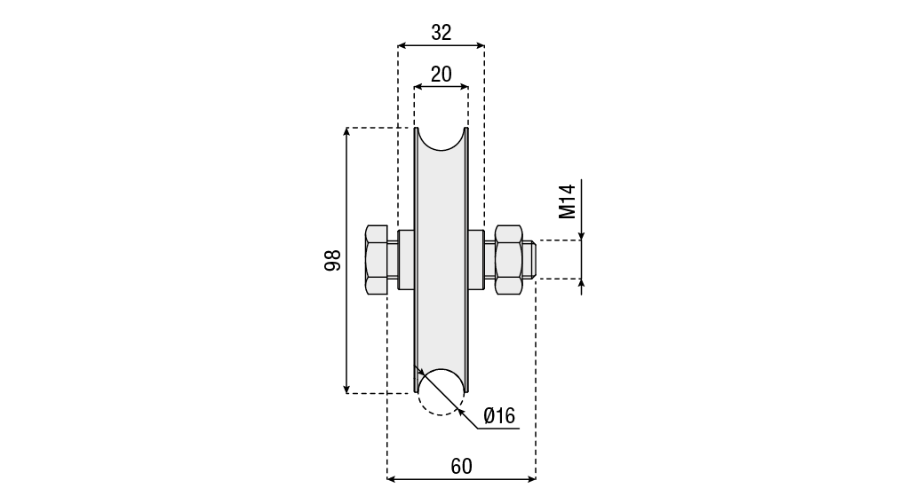 Galvanized wheel with bolt, with half-round groove, 1 bearing