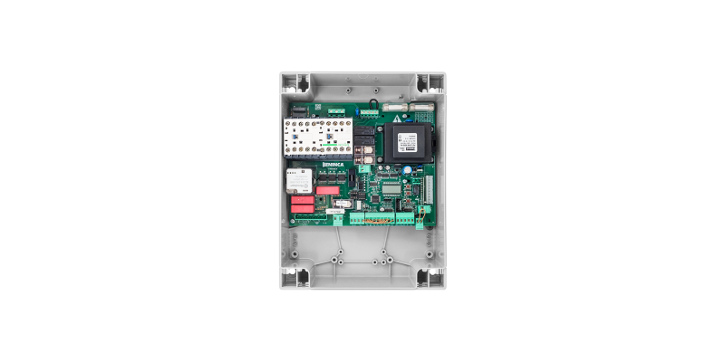 Only deadman’s logic operation | Fixed terminal boards | Motor limit switch inputs | Open, close and stop inputs | Open and close buttons integrated into the control unit | Output for connecting flashing light and auxiliary condenser for starting the motor