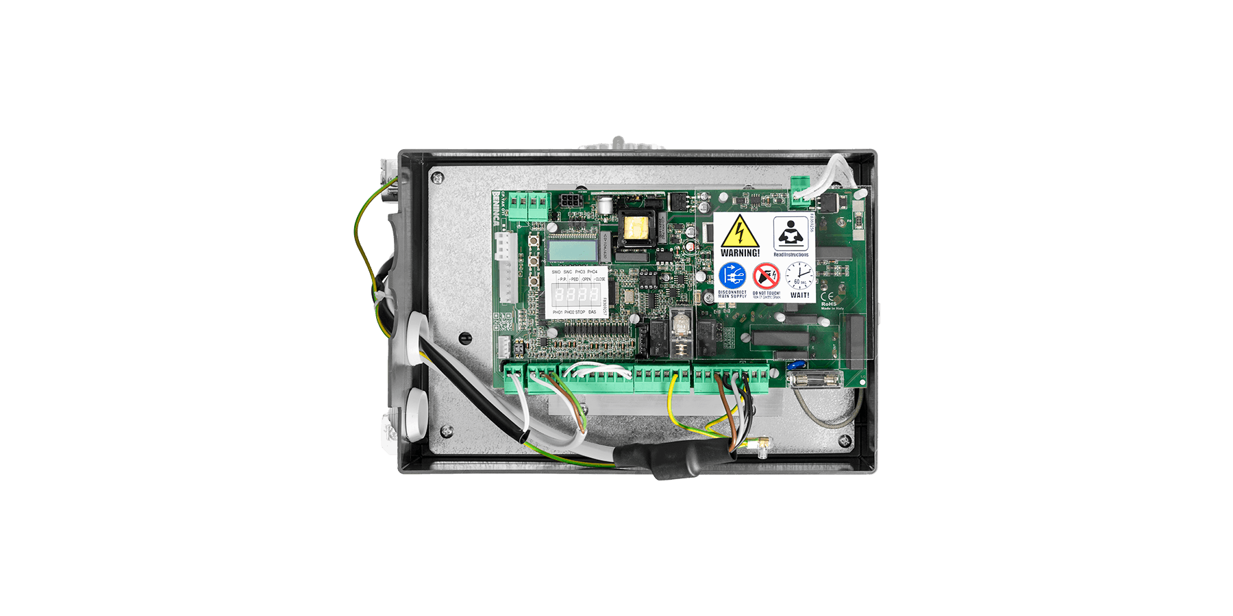 Integrated LCD display | ONE2.WB model 433.92 MHz radio receiver provided as standard equipment | Removable terminal boards | Automatic, semi-automatic and deadman’s logic | Motor limit switch inputs | Step by step, open, close, pedestrian and stop inputs | no. 2 photocell inputs configurable as active in opening-closing or in closing phases | Input for N.C or 8K2 sensitive edge | Input for safety sensor | Output configurable as gate open indicator, service light or area light | Photocell testing output | Second radio channel output | Output for connecting the flashing light | Autosetting of operating parameters | Electronic torque adjustment with automatic calculation for each point in the stroke (STC SYSTEM) | Anti-crushing safety thanks to amperometric obstacle detection | Adjustable slow-downs | Advantouch system to configure parameters and manage radio transmitters | Integrated inverter | Virtual encoder | Number of maneuvers | Programming access password | Maintenance warning