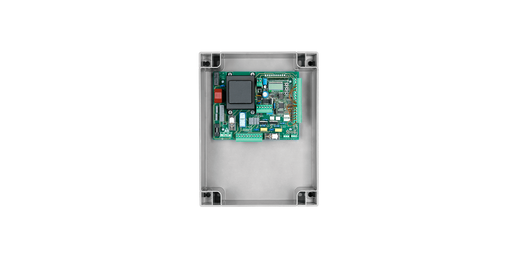 Integrated LCD display | Integrated 433.92 MHz 64-code radio receiver with 3 encoding systems (Advanced Rolling Code, Rolling Code, Fixed Code) | Removable terminal boards | Automatic, semi-automatic and deadman’s logic | Encoder input to detect obstacles | Separate limit switch inputs for each motor | Open, close, pedestrian, step by step and stop inputs | Separate photocell inputs in opening-closing and in closing phases | Input for N.C or 8K2 sensitive edge | Output for electric lock 230 Vac and 12 Vac/dc | Outputs for configuration as gate open indicator, service light, second radio channel and photocell testing | Output for connecting flashing light | Autosetting of operating parameters (with motors equipped with encoder) | Separate electronic torque adjustment for each motor and operating times | Adjustable slow-downs | Advantouch system to configure parameters and manage radio transmitters| Number of maneuvers | Programming access password | Maintenance warning