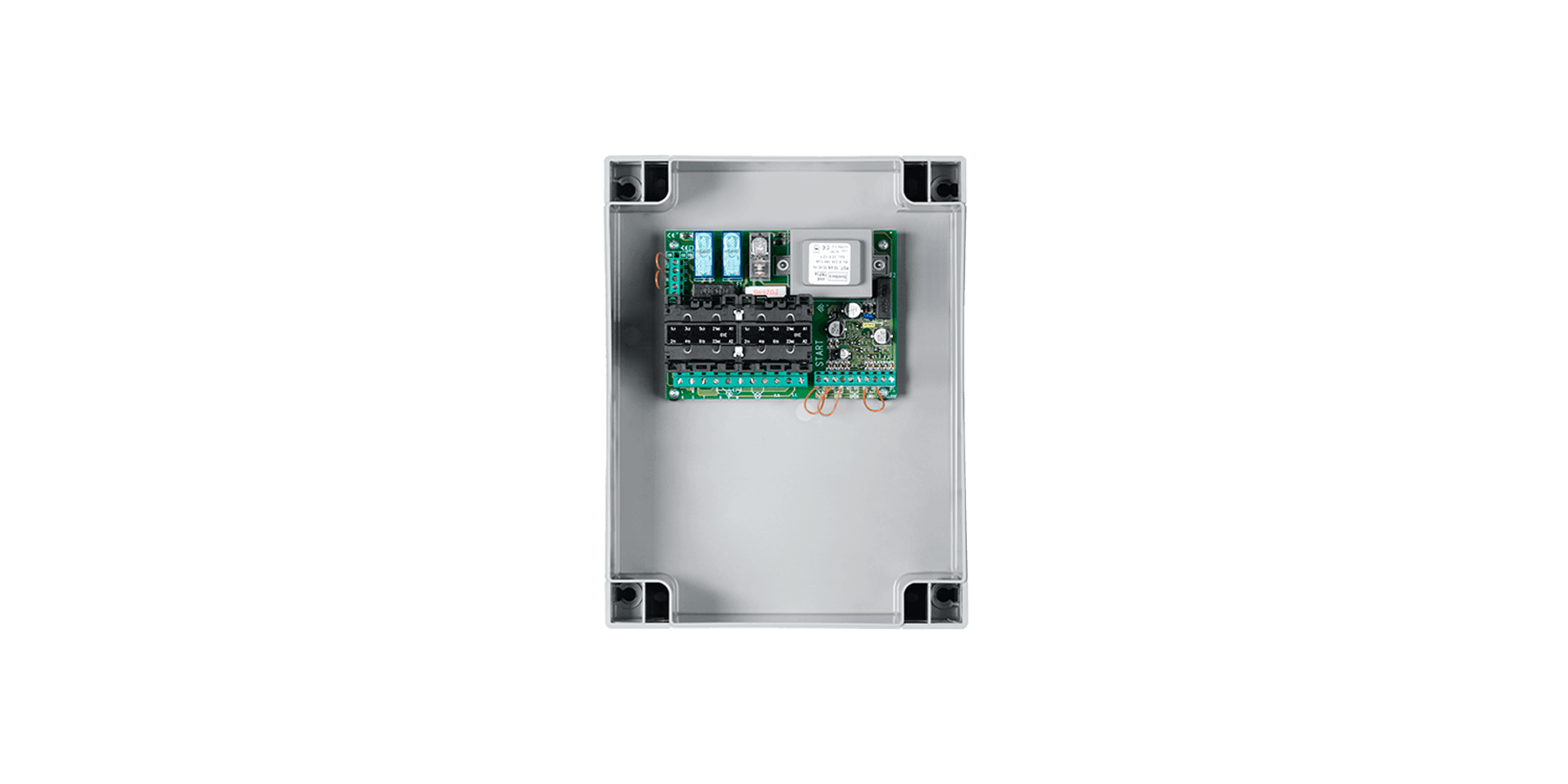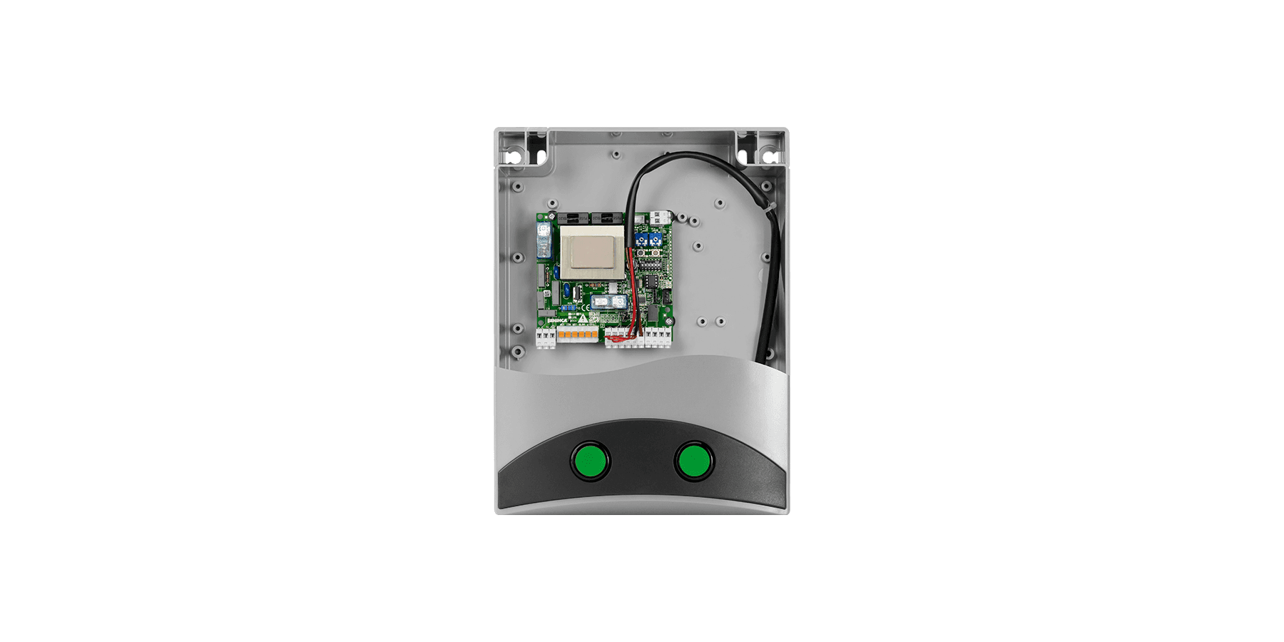 Only deadman’s logic operation | Fixed terminal boards | Motor limit switch inputs | Open, close and stop inputs | Open and close buttons integrated into the control unit | Output for connecting flashing light and auxiliary condenser for starting the motor