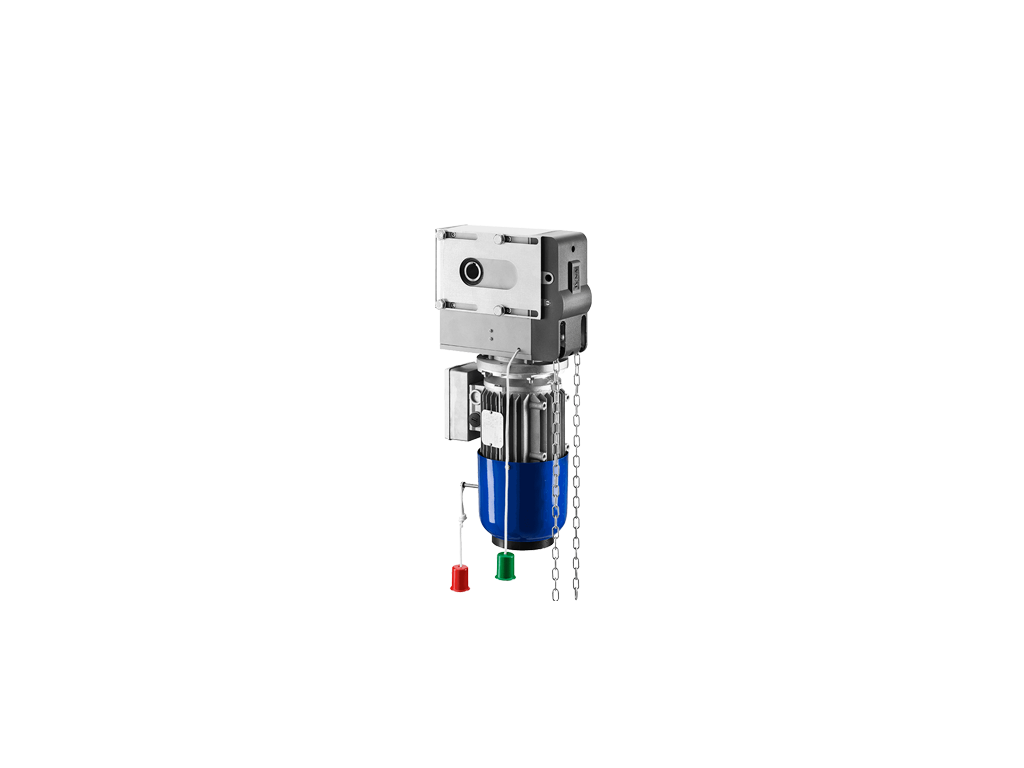 400 Vac gear motor with manual chain movement and 1/40 reduction rates | Ventilated electric motor ideal for intensive use and equipped with electric brake | Two accessories are available for chain drives with reduction rates 1:1 (offset installation of motor) or 1:1.8 (torque or speed multiplier) | Maximum safety guaranteed during rapid release phases, thanks to a micro-switch that cuts the power supply to the motor | Oil lubricated reductions with hardened steel screw and bronze gears guarantee high performance, maximum reliability and silent operation | 4 micrometrically adjustable limit switches