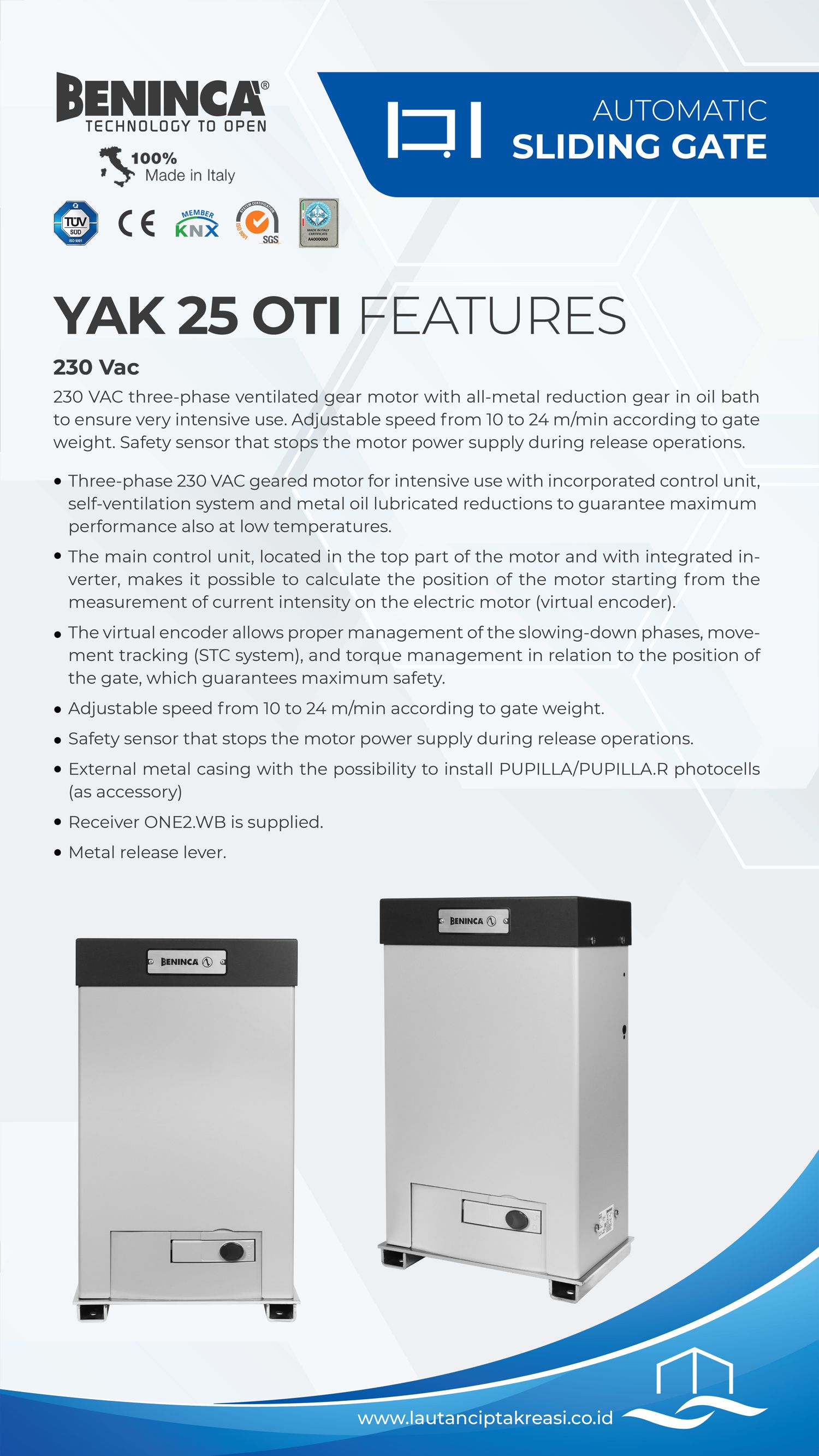 - Three-phase 230 VAC geared motor for intensive use with incorporated control unit, self-ventilation system and metal oil lubricated reduction to guarntee maximum performance also at low temperatures